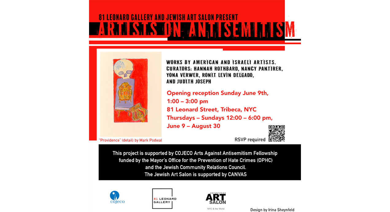 81 Leonard Gallery and Jewish Art Salon, with support from COJECO and the Natan Foundation, are proud to present Artists on Antisemitism I, a survey of Jewish artists’ responses to the current global surge of antisemitism. Among artists of varying nationalities, familial histories, and levels of religiosity, a duality emerges between cautiously reflecting on traumatic narratives and driving forward with courage and optimism. The works on view form a spectrum between these two points of view, with many artists exploring the gray areas in the middle.